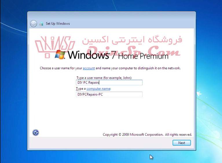 آموزش نصب ویندوز ۷ – مرحله هفتم- انتخاب نام سیستم عامل و رمز گذاشتن برای ورود به ویندوز ۷