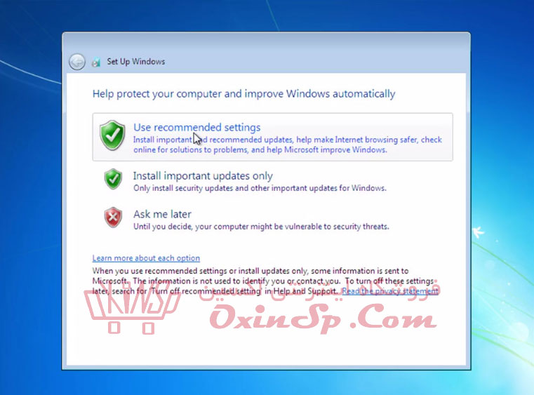 اگر از ویندوز اورجینال استفاده میکنید گزینه اول یعنی Use recommended setting و در غیر این صورت بر روی گزینه ی آخر یعنی Ask Me Later کلیک کنید تا وارد صفحه بعد بشوید.