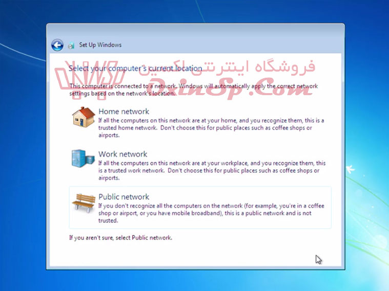 آموزش نصب ویندوز ۷ – مرحله یازدهم – انتخاب مکانی که می خواهید در آن از ویندوز ۷ استفاده کنید.