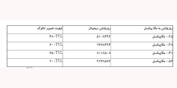برای اینکه میزان دقت تصویر در دوربین‌ها با TVLهای مختلف ملموس‌ تر شود در جدول زیر معادل تفکیک‌پذیری به مگاپیکسل برای تیوی لاین‌های مختلف ذکر شده است.